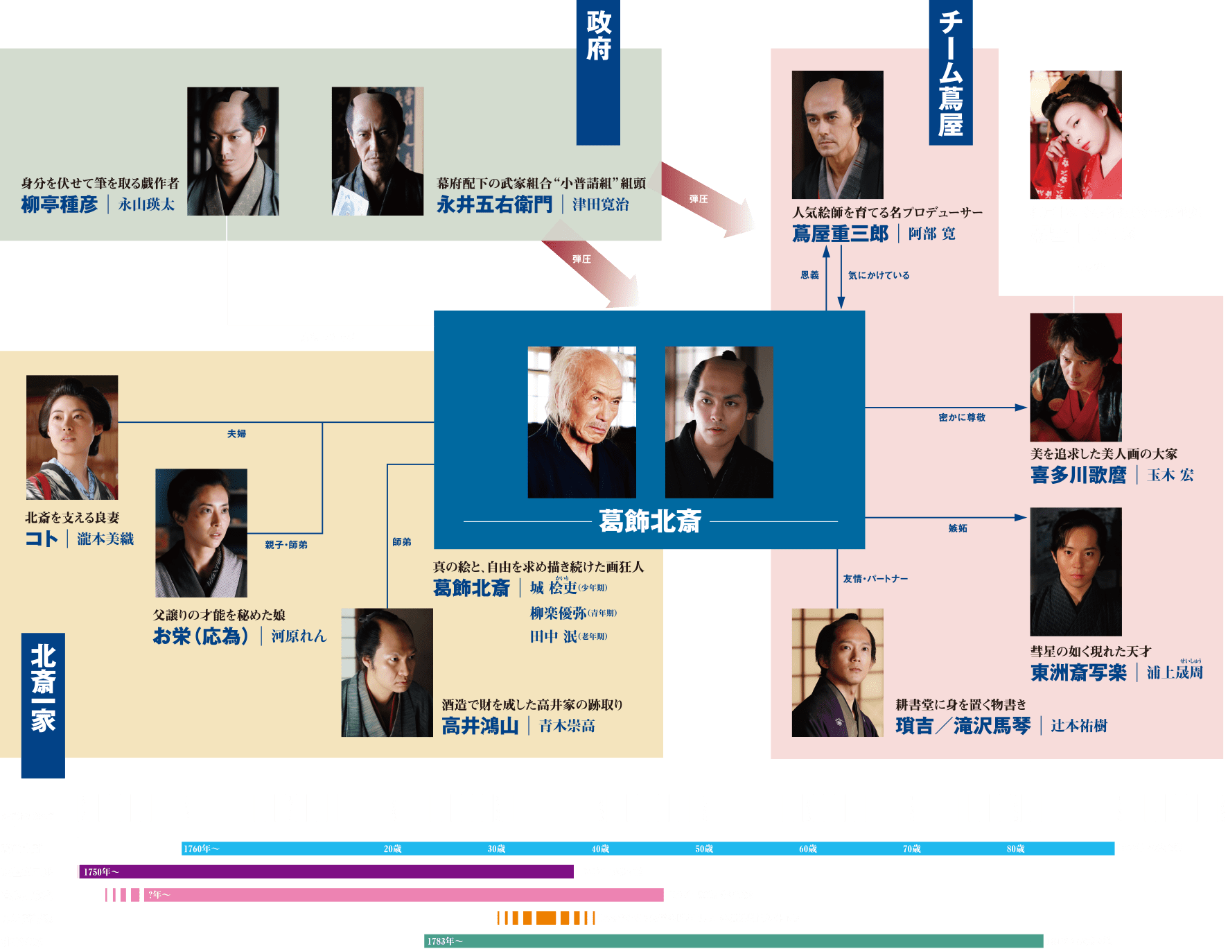 腕はいいが、食うことすらままならない生活を送っていた北斎に、ある日、人気浮世絵版元(プロデューサー)蔦屋重三郎が目を付ける。しかし絵を描くことの本質を捉えられていない北斎はなかなか重三郎から認められない。さらには歌麿や写楽などライバル達にも完璧に打ちのめされ、先を越されてしまう。“俺はなぜ絵を描いているんだ?何を描きたいんだ?”もがき苦しみ、生死の境まで行き着き、大自然の中で気づいた本当の自分らしさ。北斎は重三郎の後押しによって、遂に唯一無二の独創性を手にするのであった。描き続けた、その先に─。